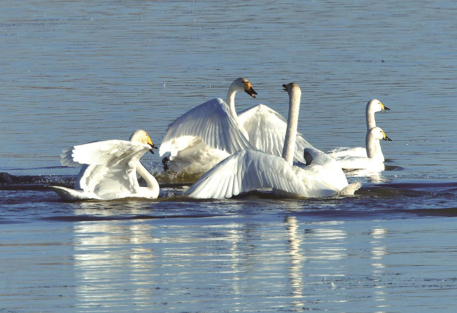 深秋時節,又到了候鳥遷徙的季節。在赤峰北部旗縣,大批候鳥在湖泊、河流、農田里棲息覓食,呈現萬鳥翱翔的壯觀景象。圖為天鵝在翁牛特旗其甘湖里嬉戲。 (周建軍 李瑞豐)