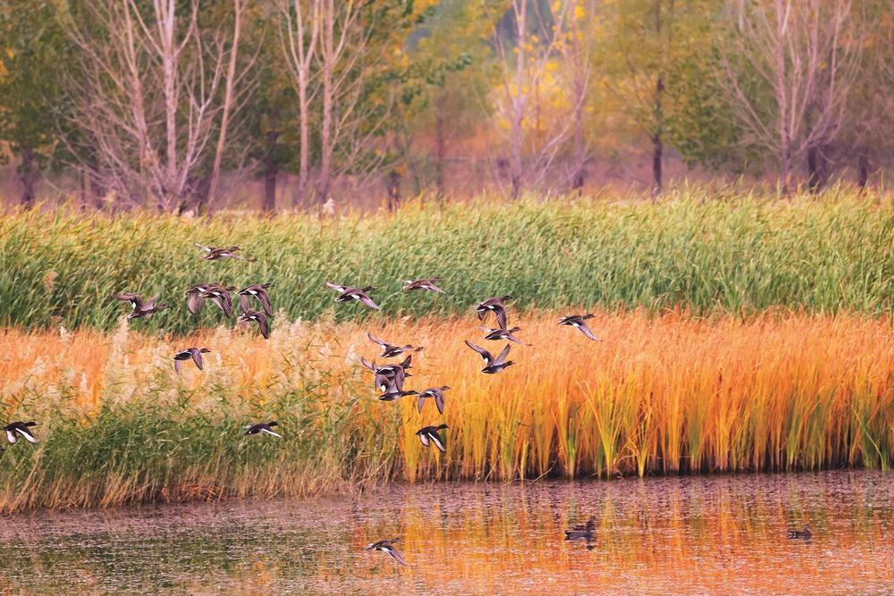 沿著黃河岸邊的公路前行,不遠處便是龍游灣國家濕地公園。這里的秋景更是別有一番風味。樹木褪去了翠綠,換上了耀眼的金黃,廣袤的田野里,一捆捆草垛錯落有致地散布在草地上,訴說著豐收的喜悅。遠處的蘆葦蕩與天際線相連,蘆葦花在風中輕舞,時而聚攏、時而散開,與水面上掠過的水鳥構成靈動的剪影。林間的候鳥也多了起來,一群群白鷺在水面上盤旋,偶爾俯沖下去,叼起一條小魚,然后又展翅飛向遠方,給這片寧靜的濕地增添了幾分生機與活力。